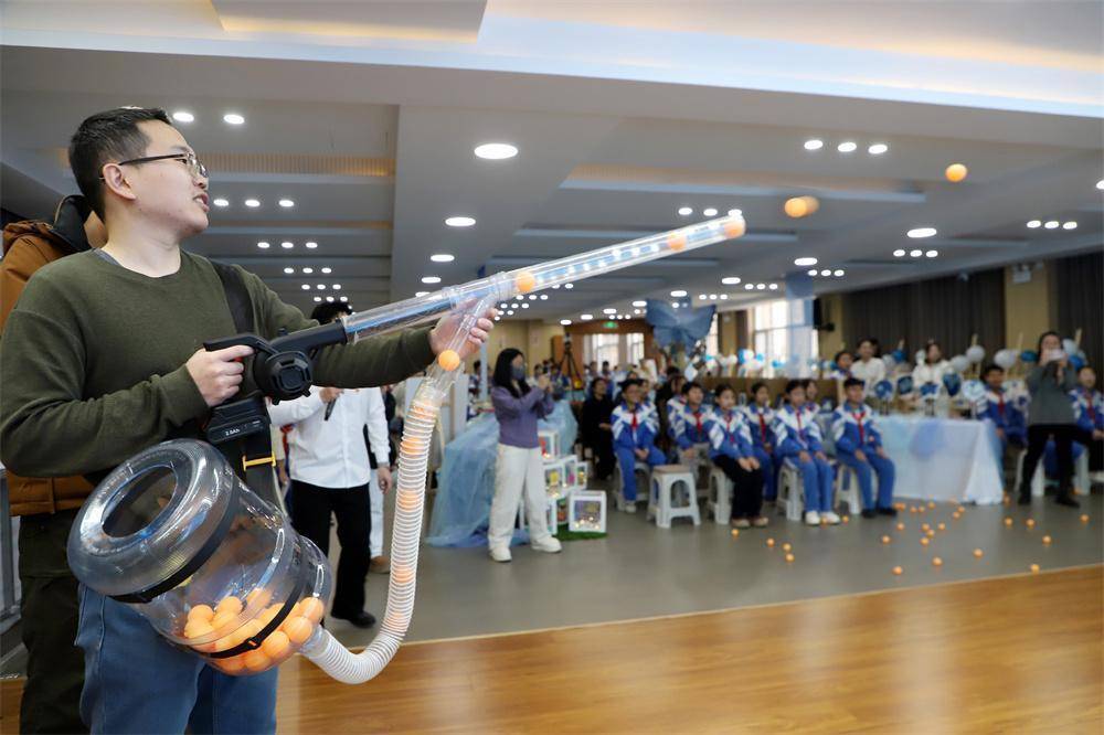 一位老师操作着由透明炮管、储料罐和气动系统组成的趣味装置,乒乓球从炮管中连续发射而出。魏志广摄