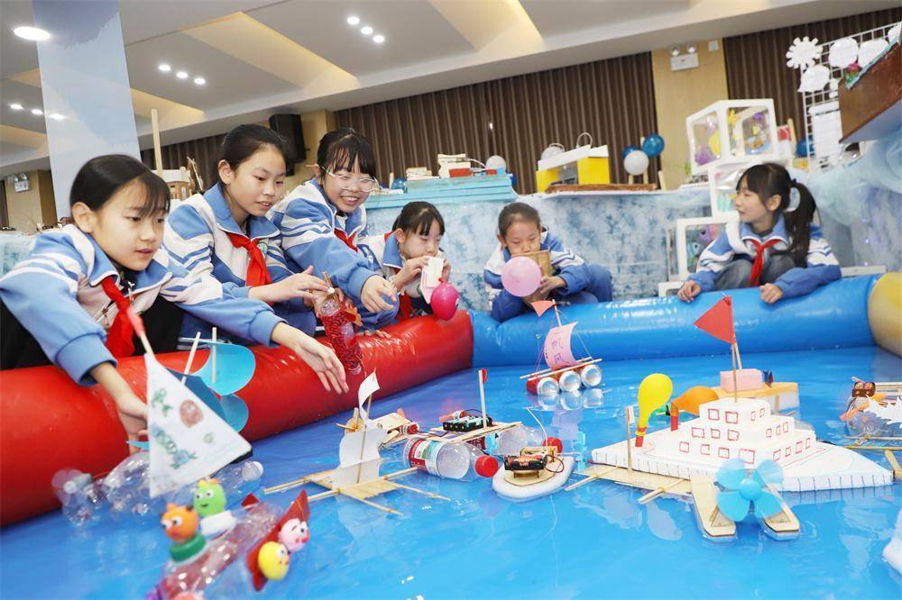 自制小船畅游水中,孩子们绽放开心的笑容。魏志广摄