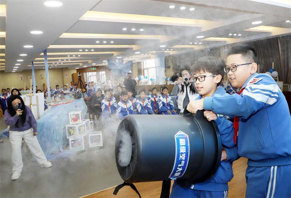 孩子吹起小船的动力气球。魏志广摄近日,沧州市中宇小学第二届科技节拉开帷幕。本届科技节设立光影逐梦、声传梦想、液压载航等主题展区,让学生们在实验与挑战中解锁科学奥秘,追逐科技梦想。