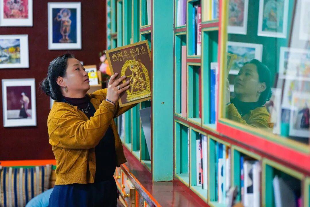 达瓦卓玛在“钦乐民宿”公共空间整理提供给住客阅读的书籍。2025年,国家对法国、巴西等国实行30天免签政策,大大增加了卓玛家的涉外接待量。小镇之外,雀儿山已经打通隧道,甘孜格萨尔机场每天都有去往成都的飞机,人们无需大费周章就能抵达这个世外桃源。