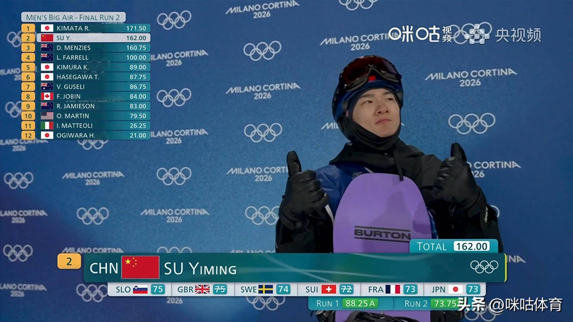 前两跳结束后,苏翊鸣目前以总分162分暂列第二位。一起为苏翊鸣第三跳加油!