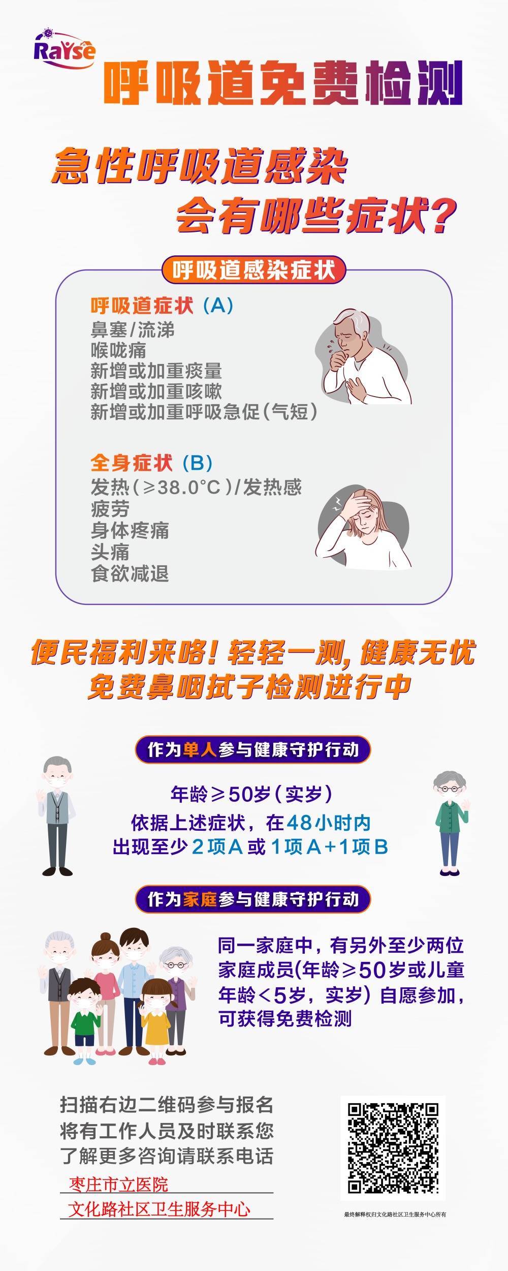 RAISE项目枣庄分中心旨在通过2年时间,为文化路街道范围内的中老年呼吸道感染者及其同住者,免费提供呼吸道合胞病毒、流感病毒等13种病原体检测(总价值1000元),以构建“医院-社区-家庭-个体”联动网络,筑牢呼吸道传染病防控“桥头堡”,减轻群众就医负担。