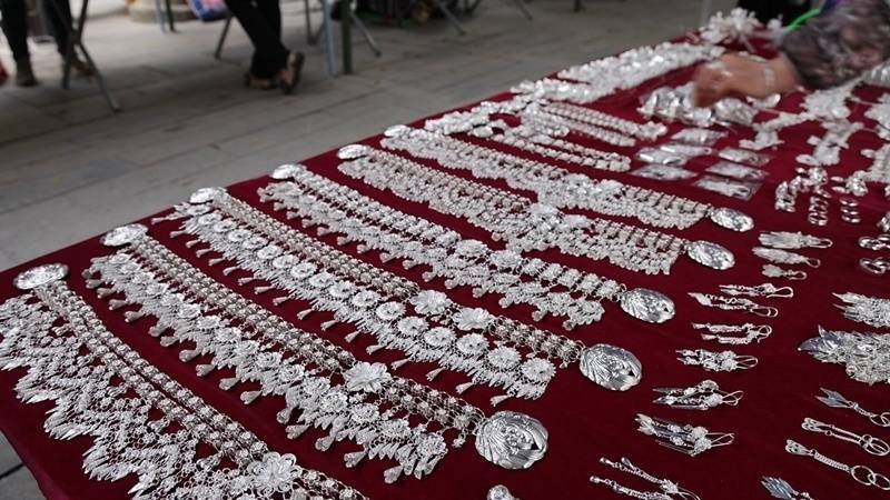 各种款式的银饰琳琅满目、整齐排列。