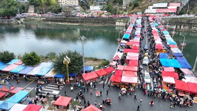 街道一旁,专门卖民族服饰和银饰的摊位热闹非凡。各种服装色彩缤纷、五彩斑斓,各种款式的银饰琳琅满目、整齐排列。十里八乡的乡亲们赶来这儿置办商品,头巾、锦带、银饰等手工艺品琳琅满目。前来采购的市民们熙熙攘攘,在各个摊位间穿梭,精心挑选着心仪的商品,脸上洋溢着幸福的笑容。