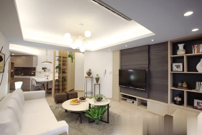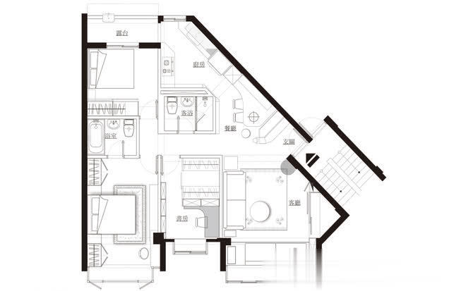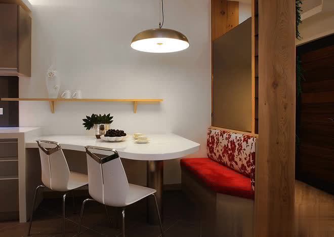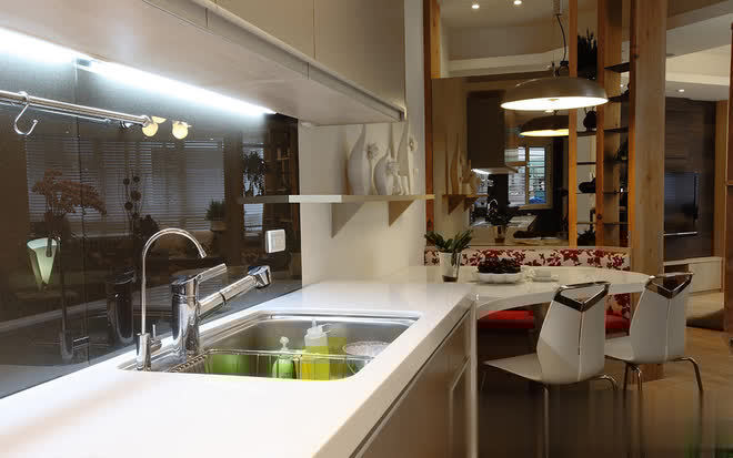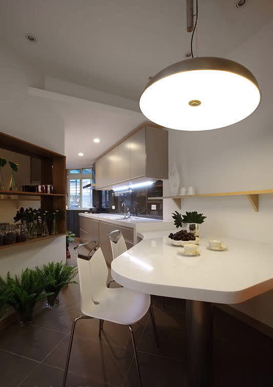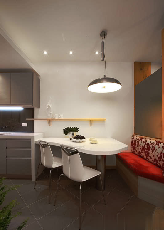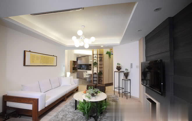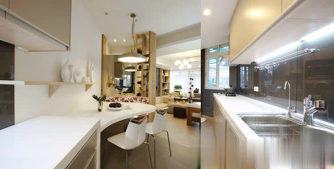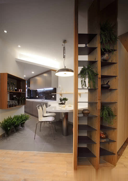 长形格局的纵长感,透过线性元素的延伸予以巧妙化解,呼应玄关天花处灰镜框线,端景隔屏两侧採长条灰镜延伸视野并丰富层次,另也透过阵列於客厅背墙的纵向镜面拉升屋高,而层迭向上的天花线条与餐厅处修饰巨樑的十字轴规划,皆是运用丰富的层理线条,让空间有更多元的设